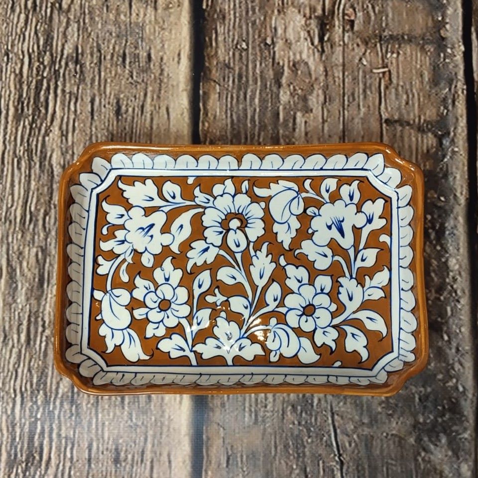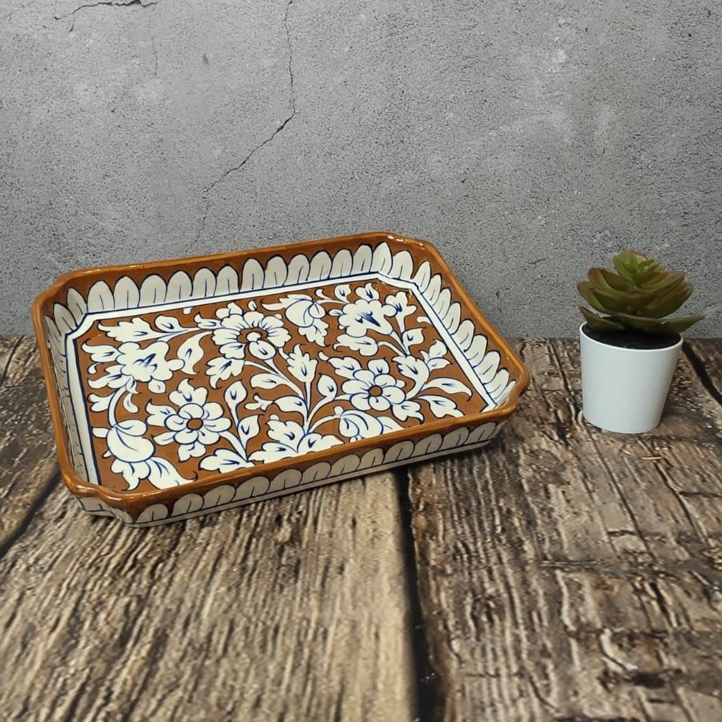 Add a vibrant touch to your tableware with this handcrafted ceramic cookie platter, available in a range of striking colors including yellow, terracotta, and more. Each platter is beautifully hand-painted with intricate floral motifs and bordered with delicate petal-inspired designs, blending traditional craftsmanship with artistic flair. Its rectangular shape with softly curved edges makes it perfect for serving cookies, snacks, or desserts in style.