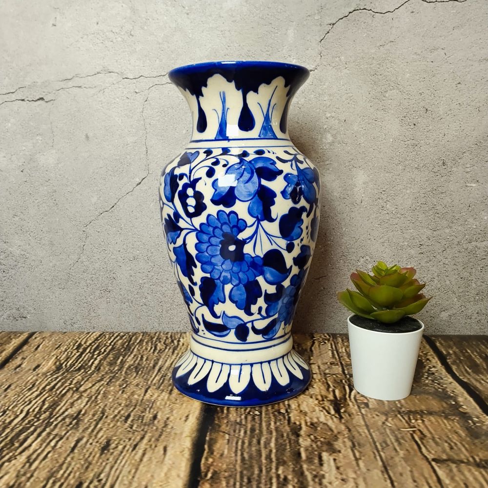 A striking handcrafted ceramic vase featuring bold white floral and geometric patterns over a deep cobalt blue background. Its elegant flared base and neck make it a standout decorative piece, ideal for tabletops or mantels. Shown next to a small artificial plant for scale.