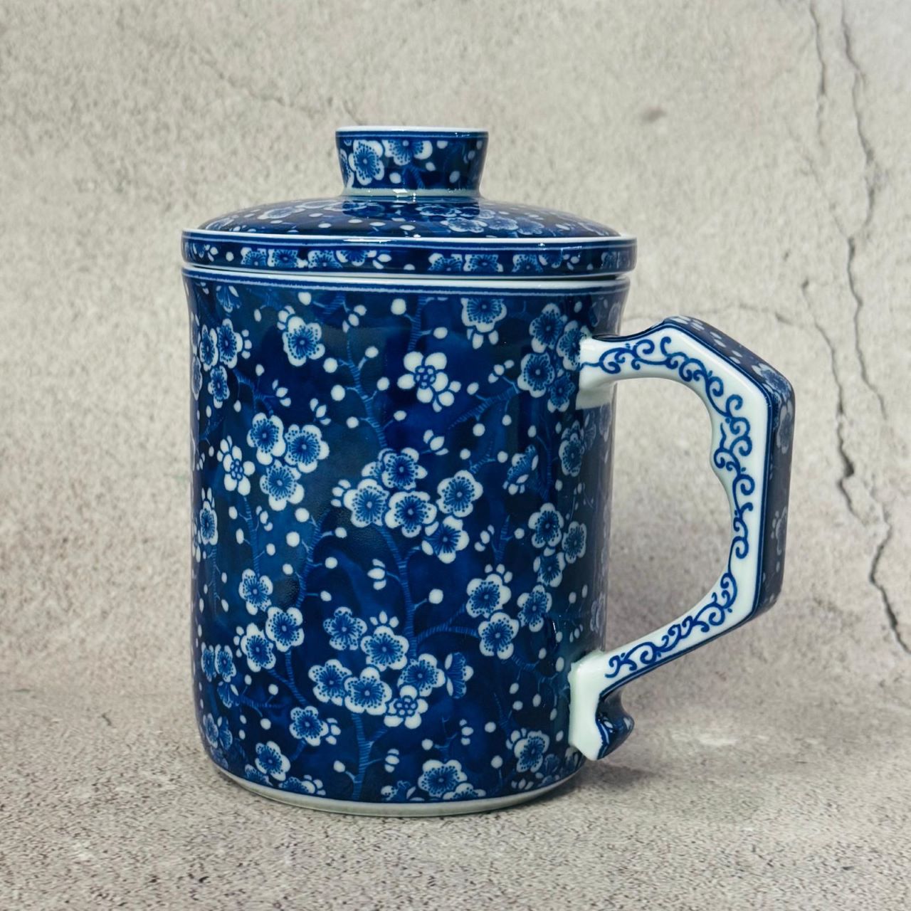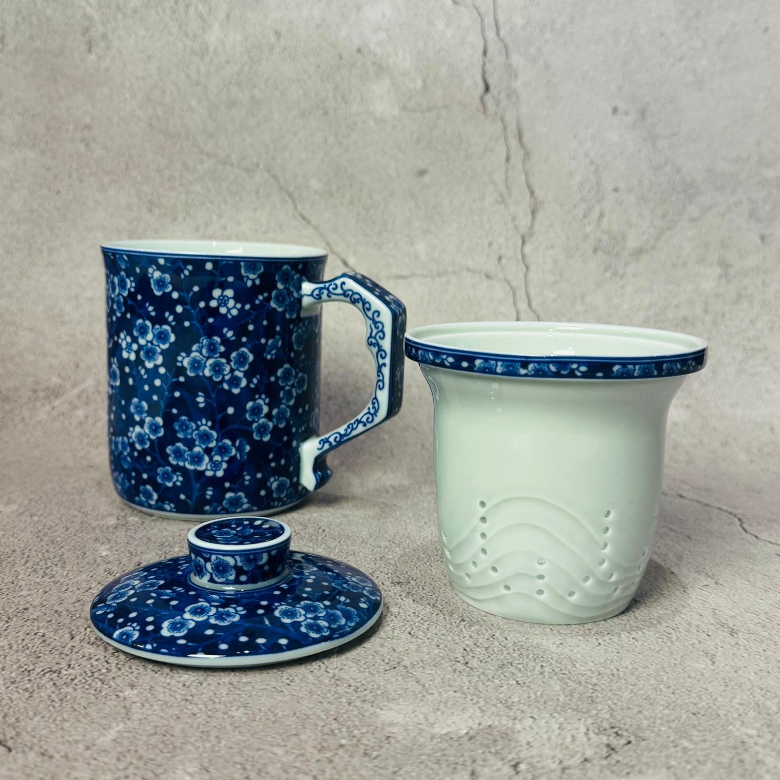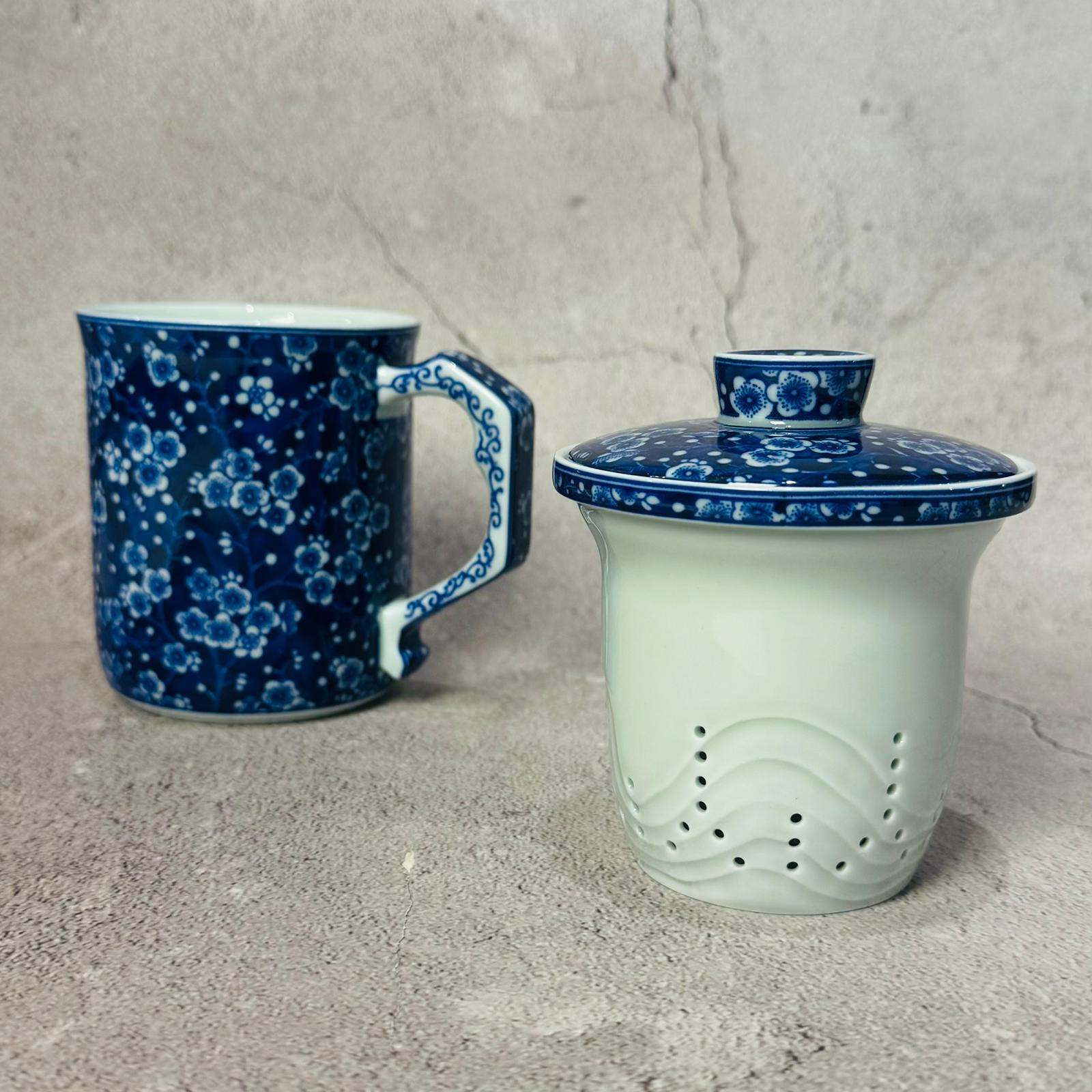 An elegant 3-piece ceramic tea mug set: mug, lid, and strainer. Intricately designed to blend tradition with convenience, ideal for loose-leaf teas.