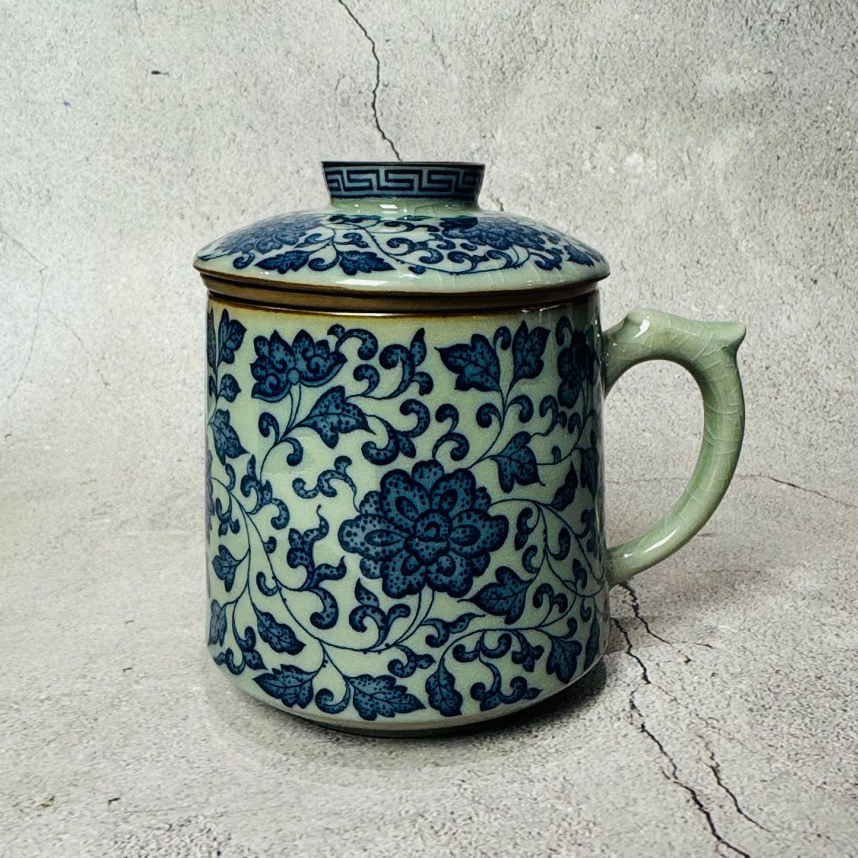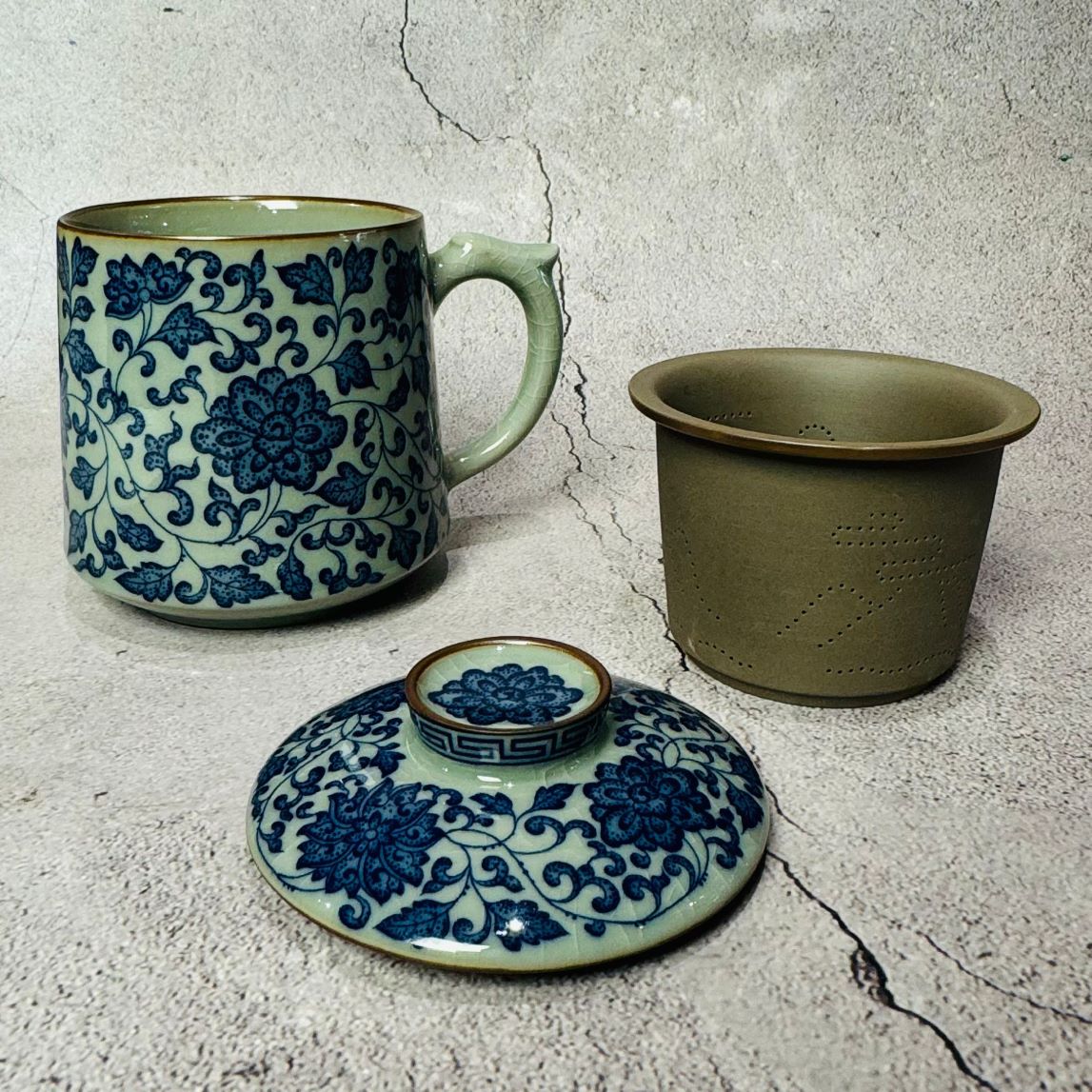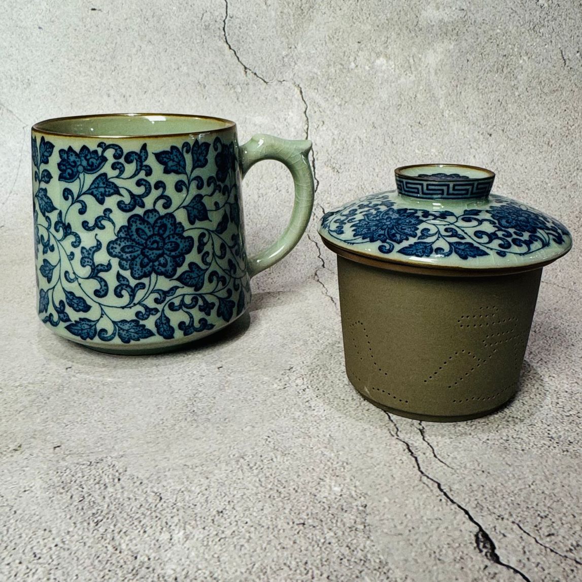 An elegant 3-piece ceramic tea mug set: mug, lid, and strainer. Intricately designed to blend tradition with convenience, ideal for loose-leaf teas.