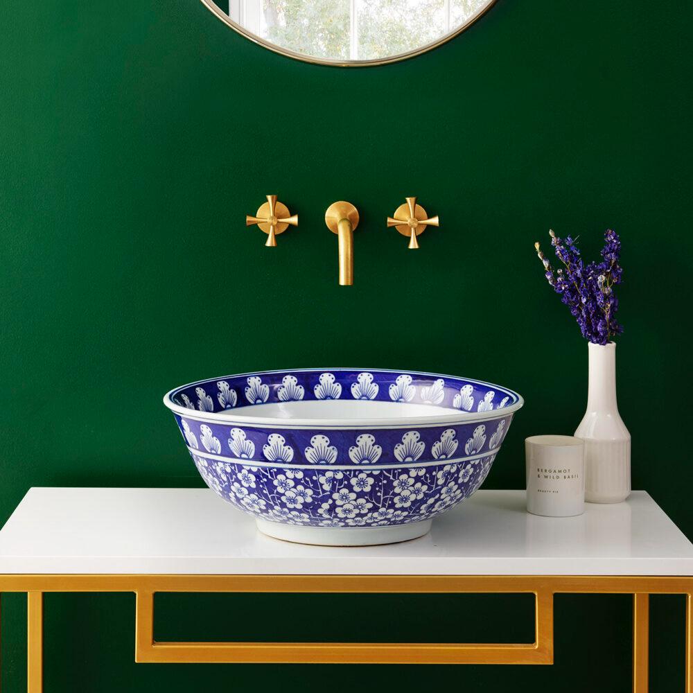 This charming round ceramic basin features a delightful White floral pattern scattered across a blue background, evoking the freshness of a blooming Blossom. Its smooth, glossy finish enhances the intricate design, making it a stylish and easy-to-clean addition to any bathroom.