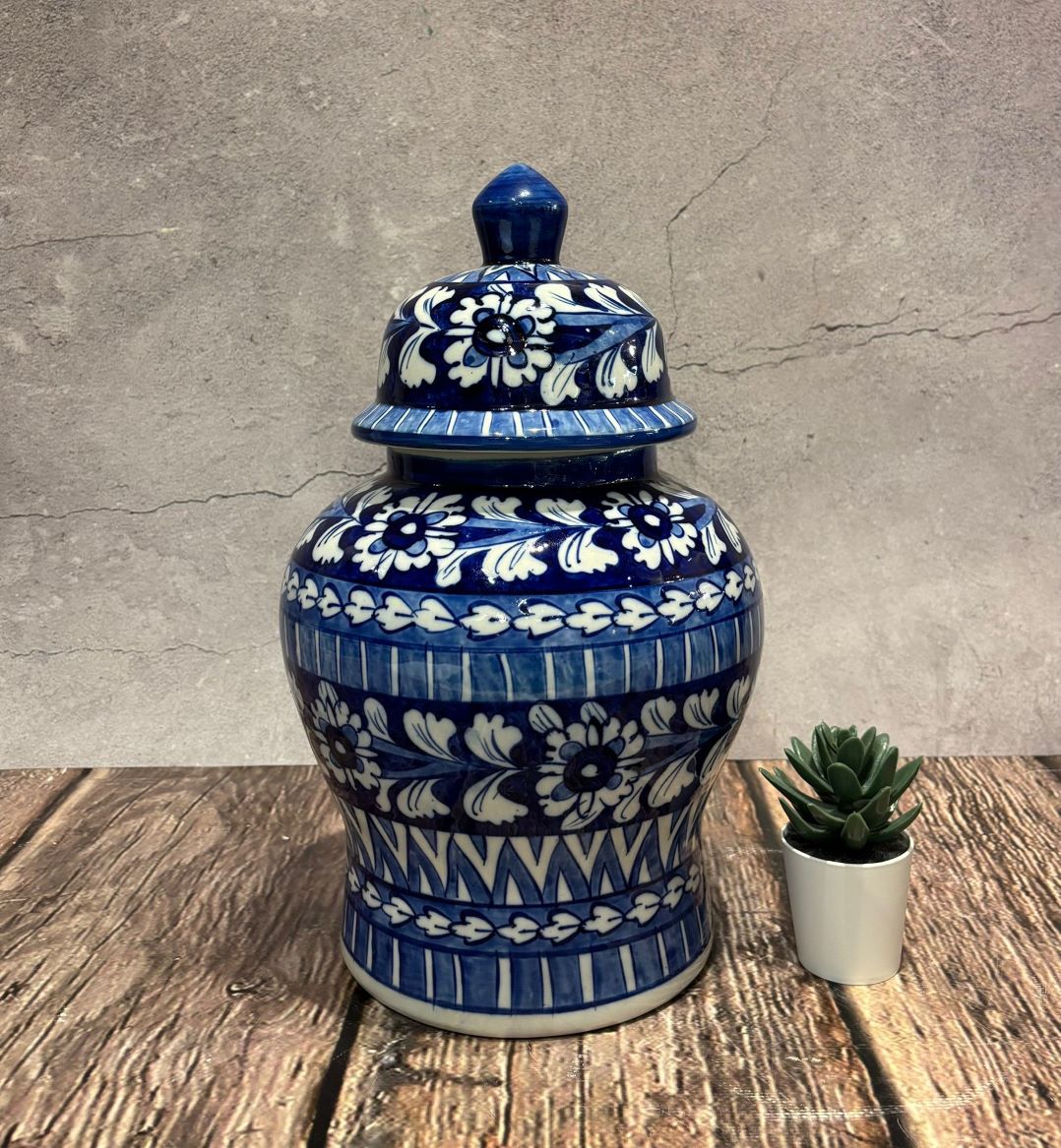 This is a handmade Blue and White Ceramic (White Flower) Ginger Jar. These decorative Jars are often used as home decor and are in