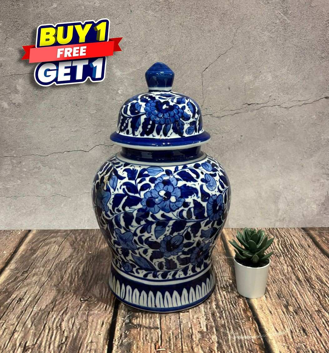 This is a handmade Blue and White Ceramic (Blue Flower) Ginger Jar. These decorative Jars are often used as home decor and are in