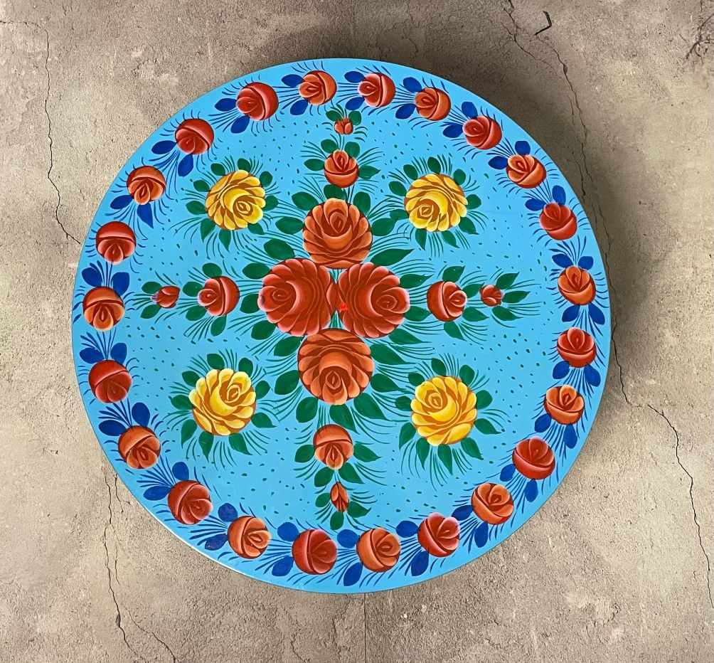 A vibrant handcrafted wooden table featuring intricate floral patterns in bold red, yellow and green on a striking Blue background. With a sturdy pedestal base and artistic detailing, it's perfect as a side table or decorative accent for indoor or outdoor spaces.