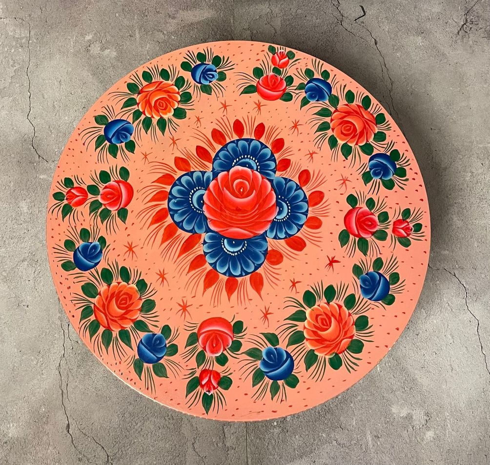 A vibrant handcrafted wooden table featuring intricate floral patterns in bold red, blue, and green on a striking Pink background. With a sturdy pedestal base and artistic detailing, it's perfect as a side table or decorative accent for indoor or outdoor spaces.