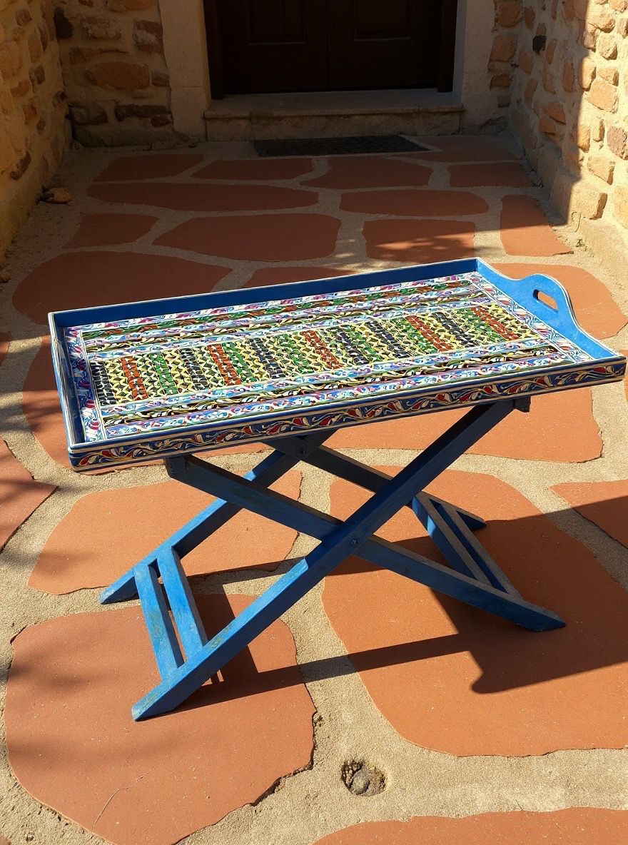 A Hand crafted foldable Wooden Tray table with a Pattern tray top. The tray has a Multicolored, Textured design with a light blue Frame,