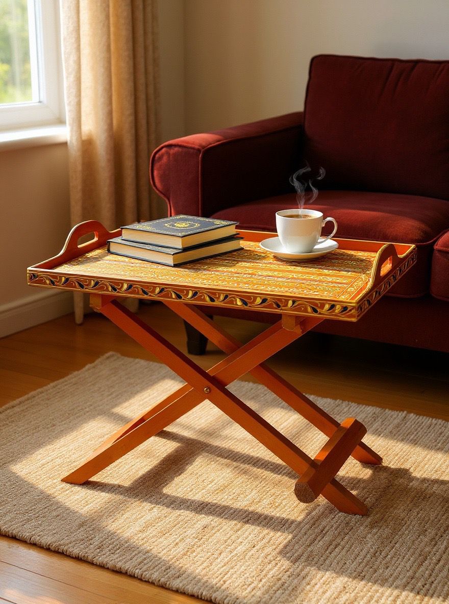 A Hand crafted foldable Wooden Tray table with a Pattern tray top. The tray has a Multicolored, Textured design with a Orange Frame,
