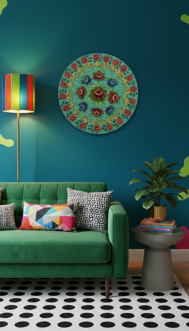 The Hanging Plate features a hand-painted design with a central floral arrangement and a decorative border, The flower are painted in shades of Blue, Red, Yellow, and Green on a light-colored background