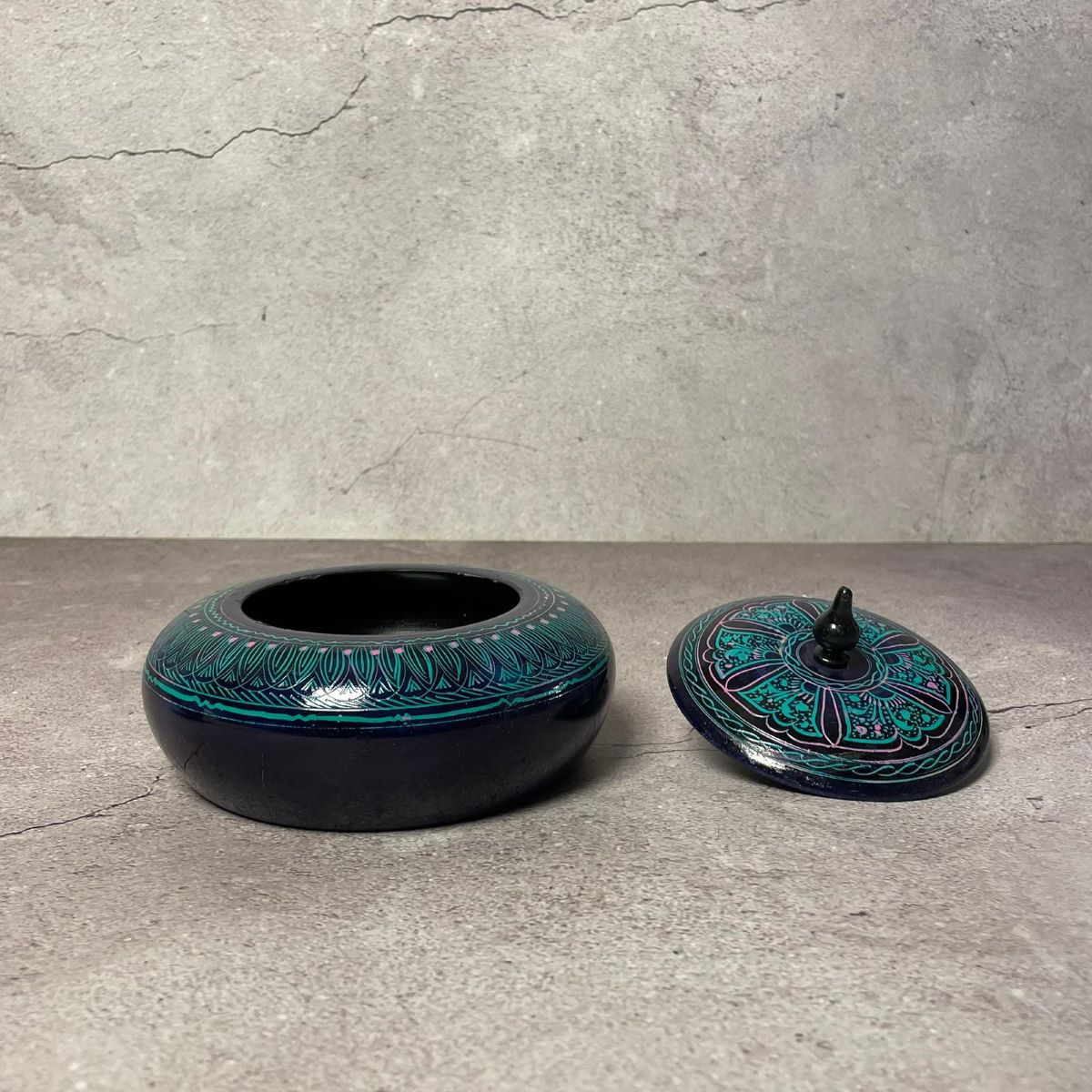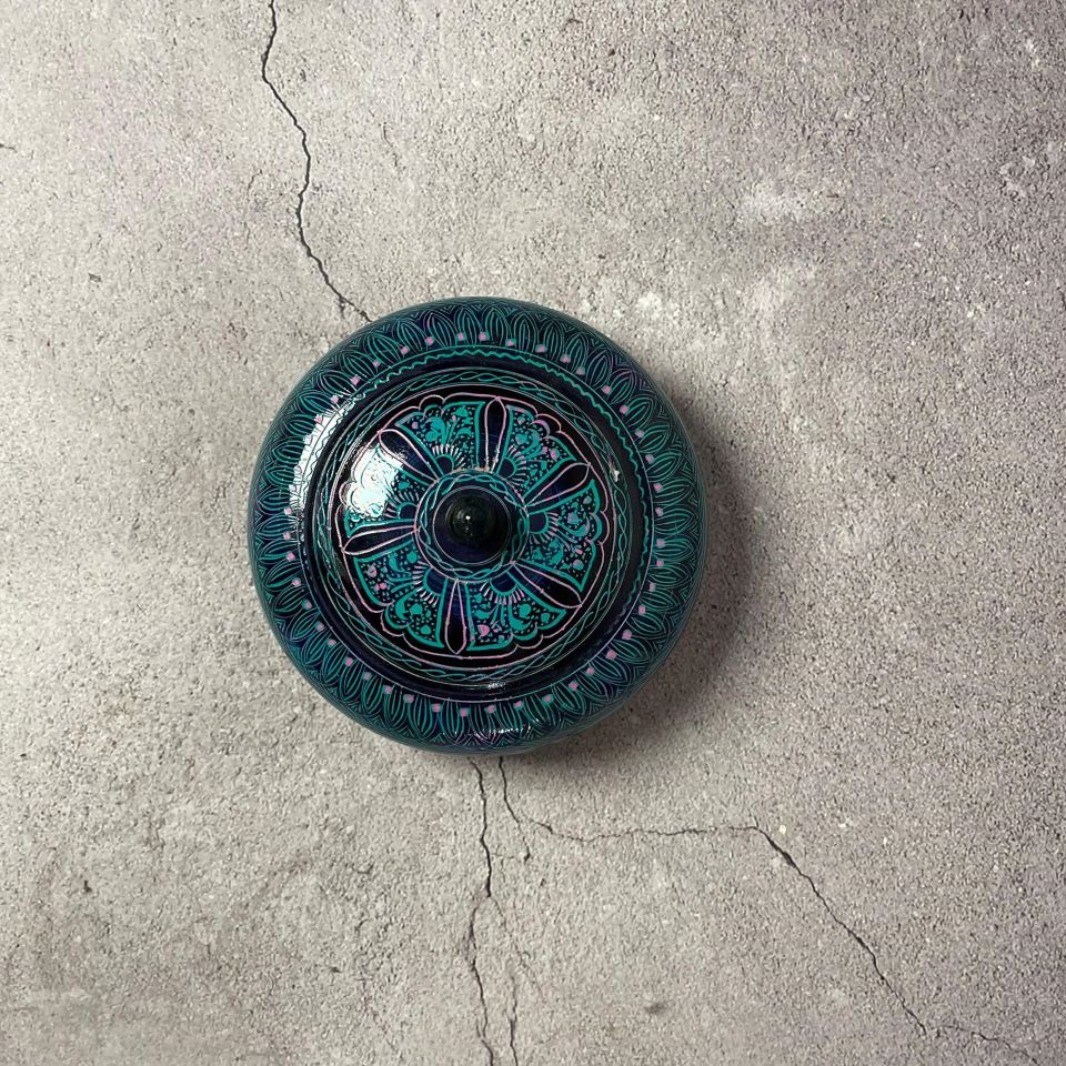 Lidded container, likely a small Bowl , featuring intricate "Nakshi" lacquer art
