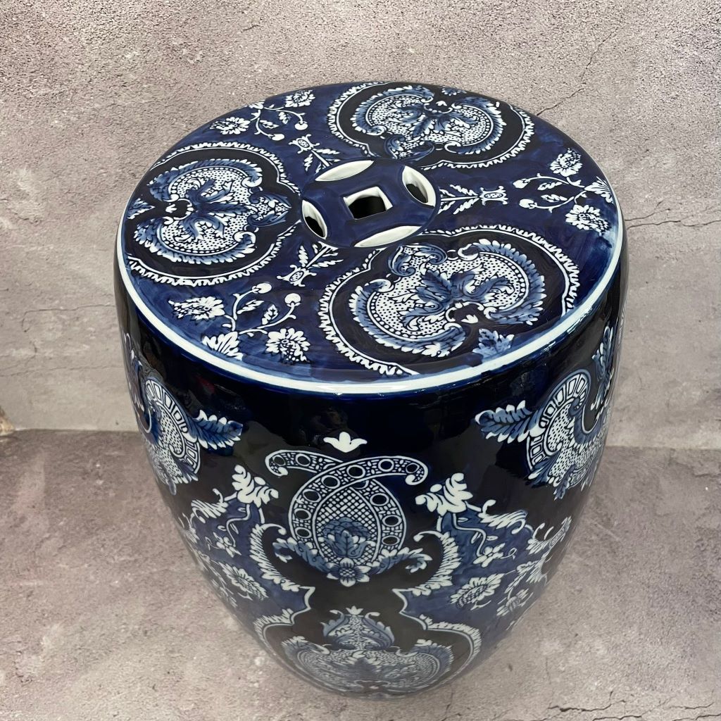 A Blue and White ceramic garden stool featuring a traditional chinoiseries-style floral and leaf. these versatile pieces are typically made of porcelain and can be used both indoors or outdoors as a decorative accent, a side table, or extra seating