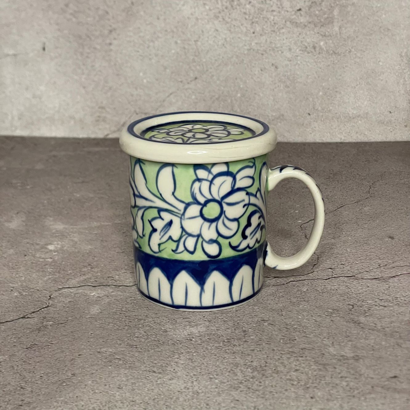 A handcrafted Ceramic Coffee mug with a Lid, often referred to as multani or Green pottery