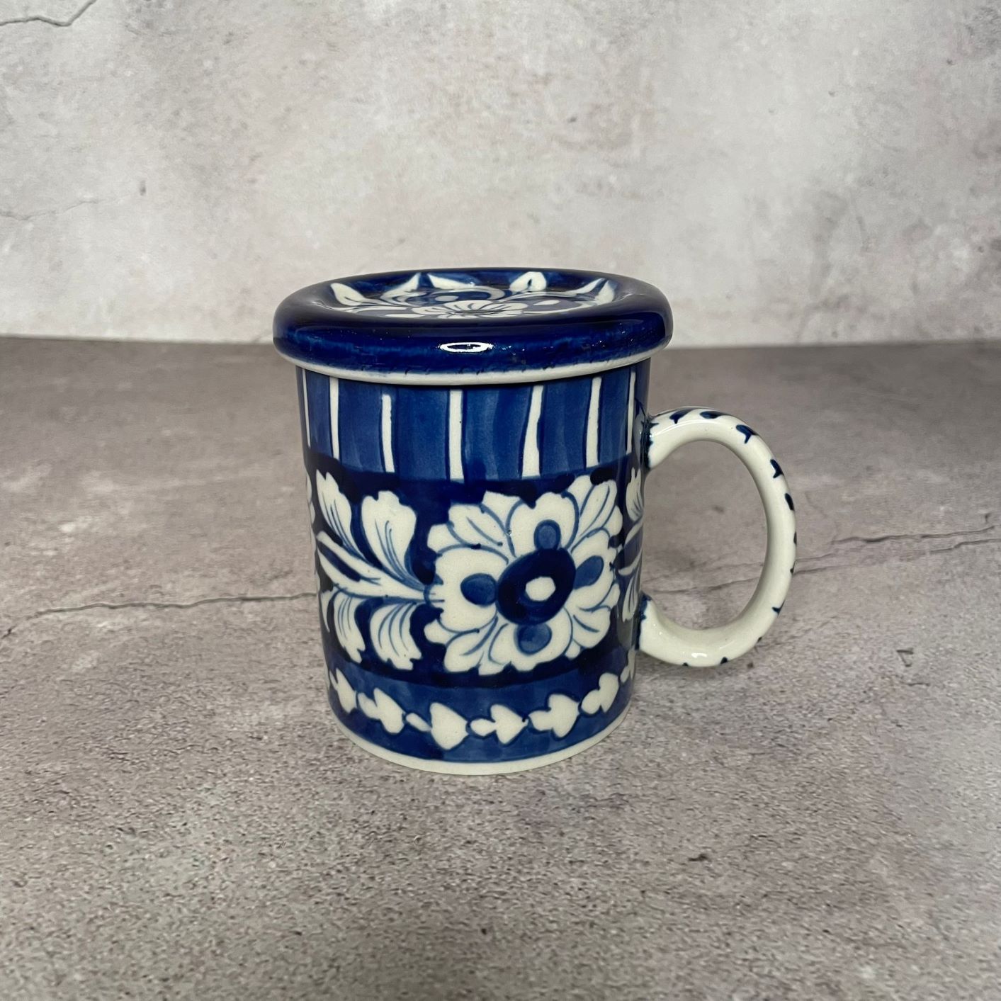 A handcrafted Ceramic Coffee mug with a Lid, often referred to as multani or Blue classic pattern2 pottery