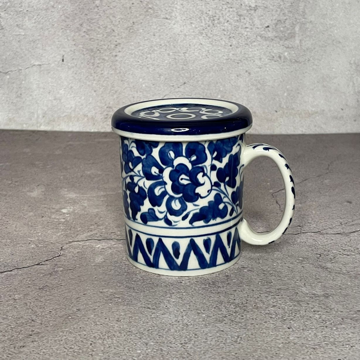A handcrafted Ceramic Coffee mug with a Lid, often referred to as multani or Blue Floral Pattern2 pottery