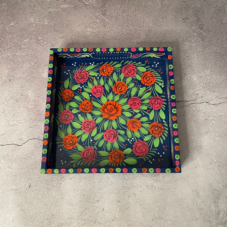 This vibrant, hand-painted wooden tray is a prime example of Pakistani Truck Art, a world-renowned folk art tradition from South Asia. It features a dense, symmetrical arrangement of bright orange and pink roses nestled among deep green leaves on a rich black background