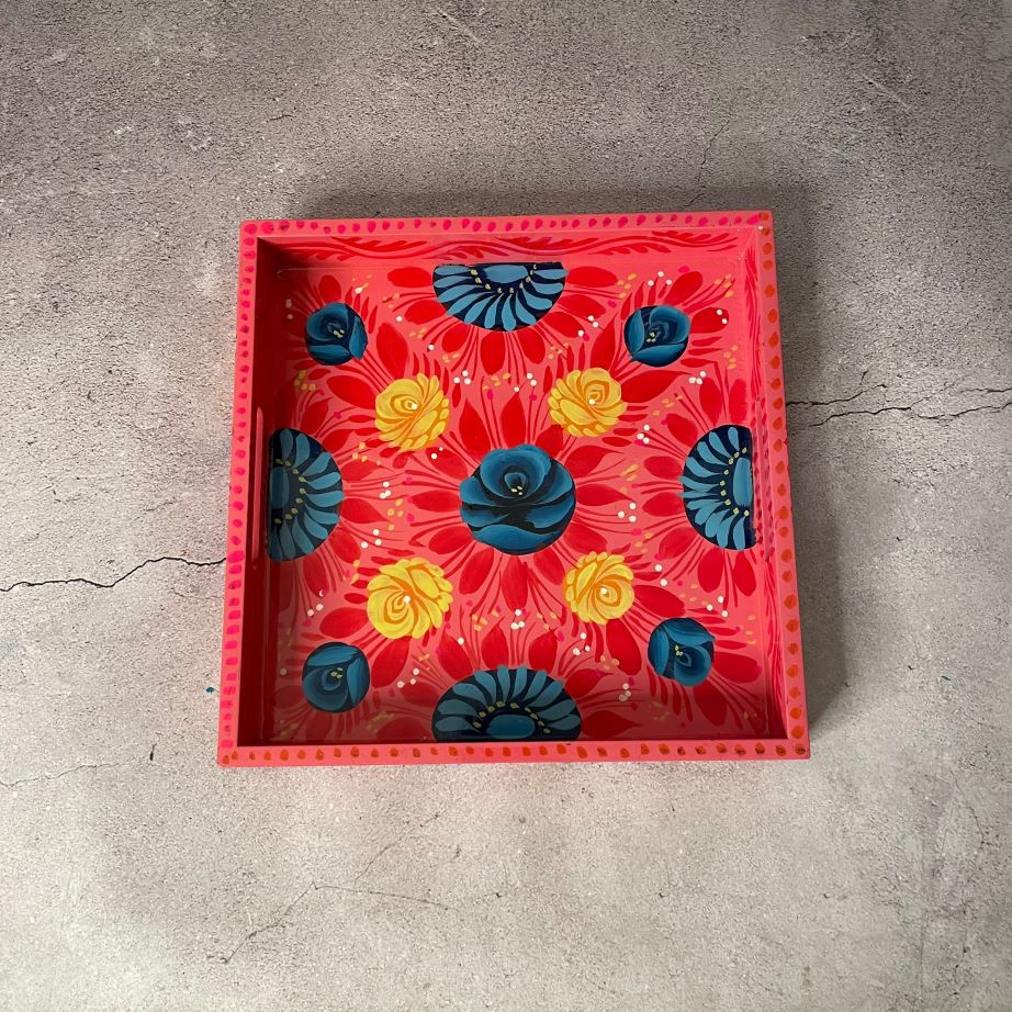 This square, hand-painted wooden tray features a vibrant floral design in a style reminiscent of Ukrainian folk art or Petrykivka painting. The central motif consists of a large blue rose surrounded by smaller yellow and blue roses, all set against a warm, burnt-orange background with delicate leaf and petal details.