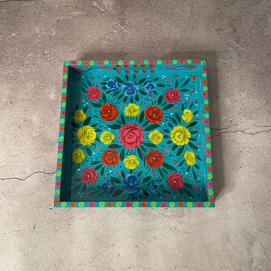 The tray features a symmetrical arrangement of brightly colored roses and lotuses on a turquoise background, framed by a decorative border of dots and smaller floral accents.