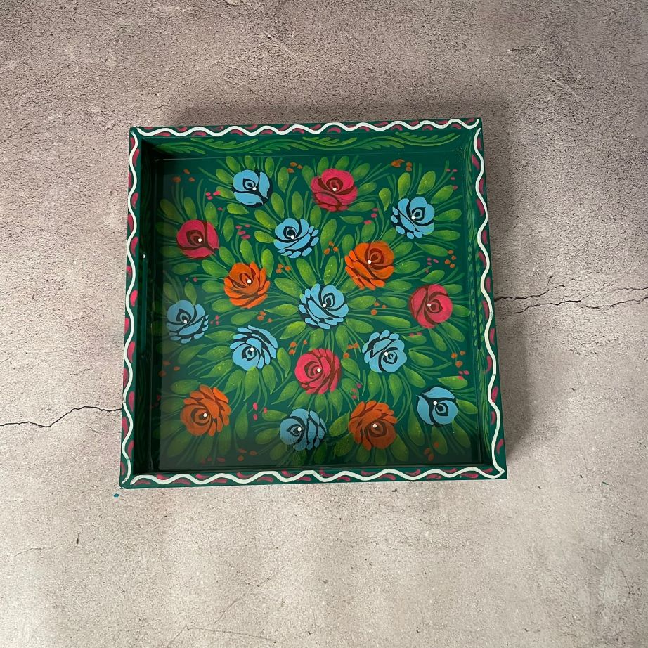 It showcases stylized roses in shades of red, blue, and orange set against a deep green background with white scalloped borders.