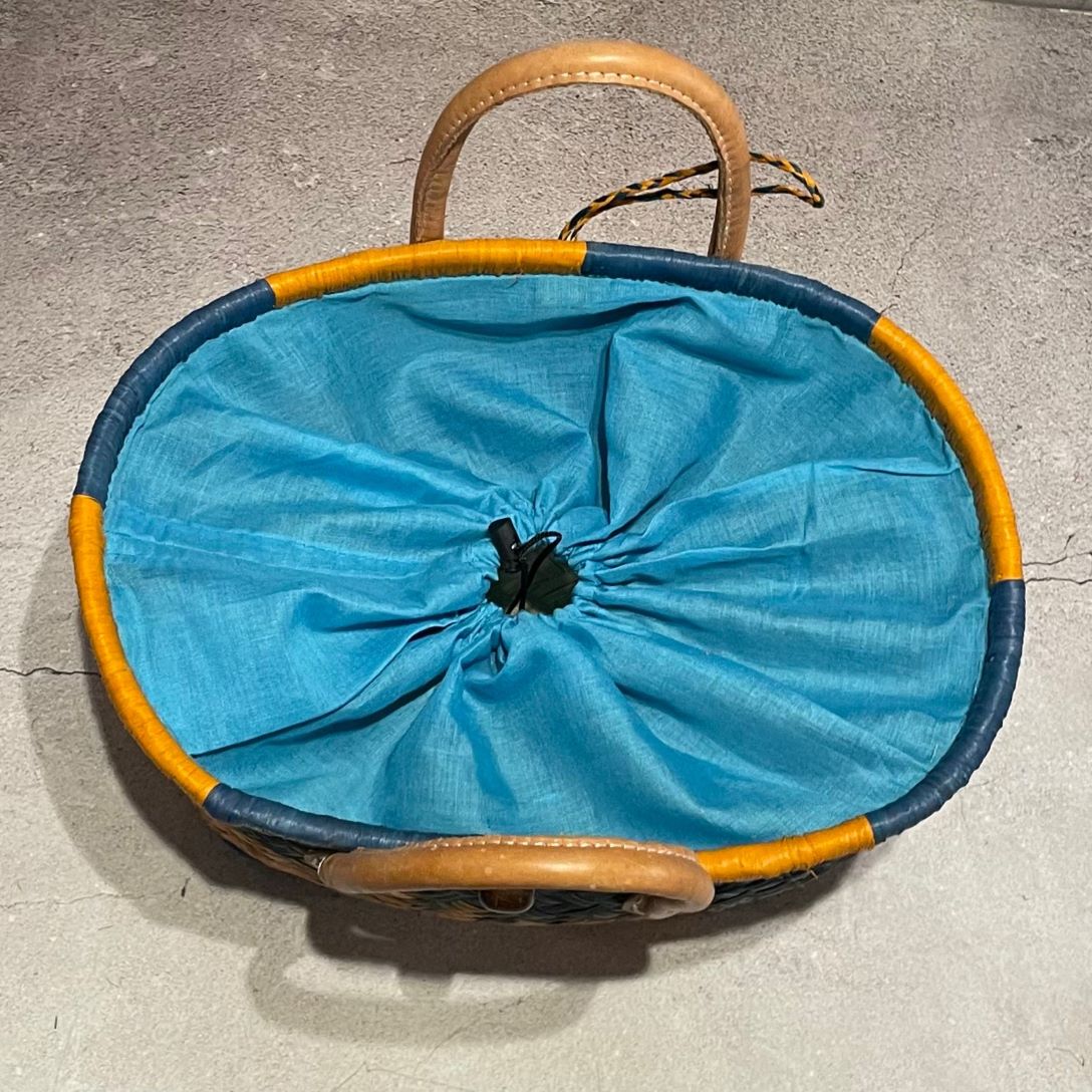 A handcrafted woven raffia basket, often referred to as a French market basket or Madagascar basket, Features a distinctive chevron or zigzag weave with a color gradient, often transitioning from natural tan to shades like blue, green, or orange.