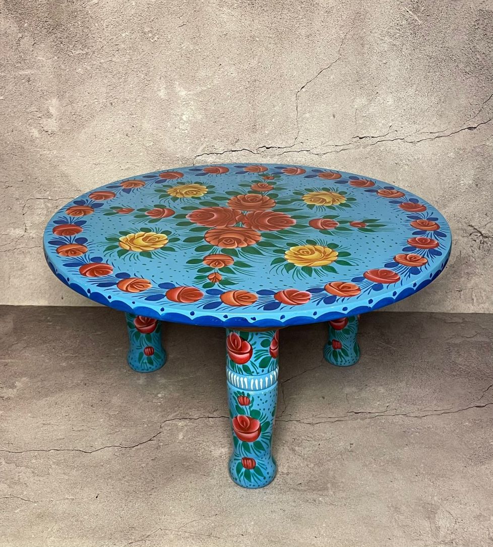 Floral Hand-Painted Wooden Small Table (Blue)