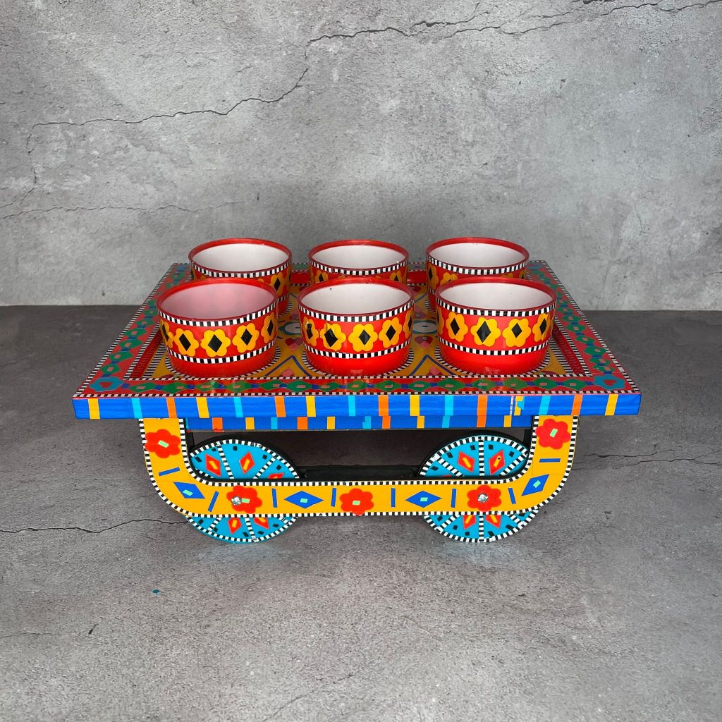 This is a Handmade Painted Wooden Tray and a Bowls set, featuring traditional South Asian "Truck Art" style.